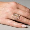 Χρυσό δαχτυλίδι από τη συλλογή BEE σε 14 ή 18 καράτια, με το χαρακτηριστικό μοτίφ της κυψέλης να αγκαλιάζει αρμονικά το δάχτυλο. Ο γεωμετρικός σχεδιασμός αποπνέει ισορροπία και φυσική κομψότητα, ενώ μια διακριτική μελισσούλα στολίζει την επιφάνεια, προσθέτοντας μια τρυφερή και ρομαντική λεπτομέρεια.