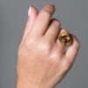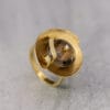 Χρυσό δαχτυλίδι από τη συλλογή KYKLOS, κατασκευασμένο σε 14 ή 18 καράτια, με κεντρική πέτρα καπνία σε στρογγυλή κοπή που αποπνέει ζεστασιά και βάθος. Ένα λαμπερό μπριγιάν 0,015 ct προσθέτει διακριτική φωτεινότητα, ολοκληρώνοντας αρμονικά το σχέδιο.