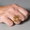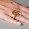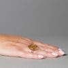 Χρυσό δαχτυλίδι από τη συλλογή ORIZONTES σε 14 ή 18 καράτια, με κυκλικό μοτίφ που θυμίζει έναν περίτεχνο “ιστό”, μέσα στον οποίο υφαίνονται έξι πέτρες τουρμαλίνης σε ζωντανές αποχρώσεις. Η διπλή, χειροποίητη βέρα στηρίζει αρμονικά το σχέδιο, προσθέτοντας σταθερότητα και κομψότητα. Ο συνδυασμός γεωμετρίας και χρώματος δημιουργεί ένα ιδιαίτερο κόσμημα με καλλιτεχνικό χαρακτήρα, που ξεχωρίζει με τη λεπτομέρεια και την αισθητική του.