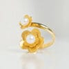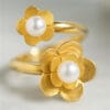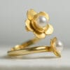 Χρυσό δαχτυλίδι από τη συλλογή PHYSIS σε 14 ή 18 καράτια. Βέρα που καταλήγει στις δύο άκρες τις σε δυό ανθάκια εξ ολοκλήρου δουλεμένα στο χέρι με δύο ολοστρόγγυλα λευκά μαργαριτάρια τοποθετημένα στο κέντρο τους. Μια δημιουργία εμπνευσμένη απο το μεγαλείο της φύσης και την ομορφιά των λουλουδιών.