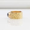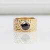 Σφυρήλατο δαχτυλίδι σε χρυσό 14 ή 18 καρατίων, με εντυπωσιακό μαύρο διαμάντι rose cut ή λαμπερό μαύρο ζιργκόν που μαγνητίζει το βλέμμα. Η φαρδιά, ανάγλυφη βάση αναδεικνύει ιδανικά την πέτρα, χαρίζοντάς της πρωταγωνιστικό ρόλο. Ο σχεδιασμός, εμπνευσμένος από γεωμετρικές επιρροές και καθαρές μινιμαλιστικές γραμμές, συνδυάζει δυναμισμό και κομψότητα.