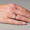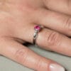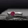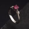Δαχτυλίδι από λευκόχρυσο 14 ή 18 καρατίων, με κεντρική πέτρα ένα πορφυρό ρουμπίνι που ξεχωρίζει για το έντονο και βαθύ του χρώμα. Στη βέρα του δαχτυλιδιού, δύο διαμάντια κοπής brilliant τοποθετούνται σε διαχρονικό ρομβοειδές σκάψιμο, αναδεικνύοντας τη λάμψη τους με διακριτικό τρόπο. Η φαρδιά βέρα προσδίδει στιβαρότητα, δημιουργώντας ένα κόσμημα με ισορροπία ανάμεσα στην κομψότητα και τον δυναμισμό.