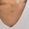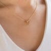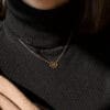 Το κολιέ σε 14 καράτια φέρει πέτρα ζιργκόν, ενώ στα 18 καράτια διατίθεται με διαμάντι κοπής brilliant, 0.015 ct.