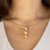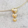 Μενταγιόν της σειράς κοσμημάτων DIATHLASIS με τρία χειροποίητα μοτίφ από χρυσό 14 ή 18 καρατίων, το καθένα διακοσμημένο με ένα λευκό μαργαριτάρι στο κέντρο. Ο γεωμετρικός σχεδιασμός συνδυάζεται αρμονικά με τη φυσική ομορφιά των μαργαριταριών, δημιουργώντας ένα κόσμημα ισορροπημένο και κομψό.