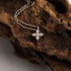 Elegant και διακριτικό σταυρουδάκι από λευκόχρυσο 18 καρατίων με διαμάντια κοπής brilliant. Ένας μοντέρνος σχεδιασμός γυναικείου σταυρού που φλερτάρει αρμονικά με την όψη ενός λουλουδιού. Ιδανικός να κοσμεί καθημερινά τον λαιμό σας, χαρίζοντας λάμψη και γοητεία!